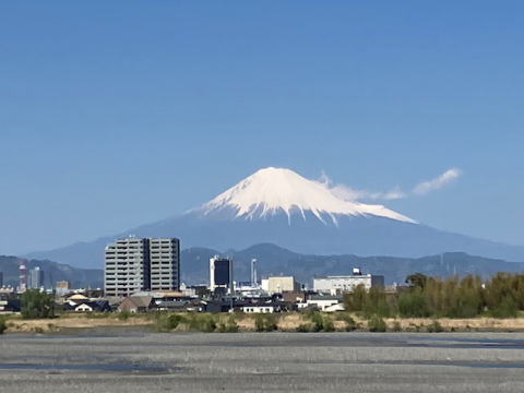 | 雪が多い今年の富士山・4月16日 平年なら、地肌が見える四月の富士山ですが、今年は寒かった三月の影響で、平地では雨でも富士山では雪になる日が多かったようです。 下の写真は4月16日撮影した雪に覆われた富士山です。五合目付近まで雪が積もっています。 |